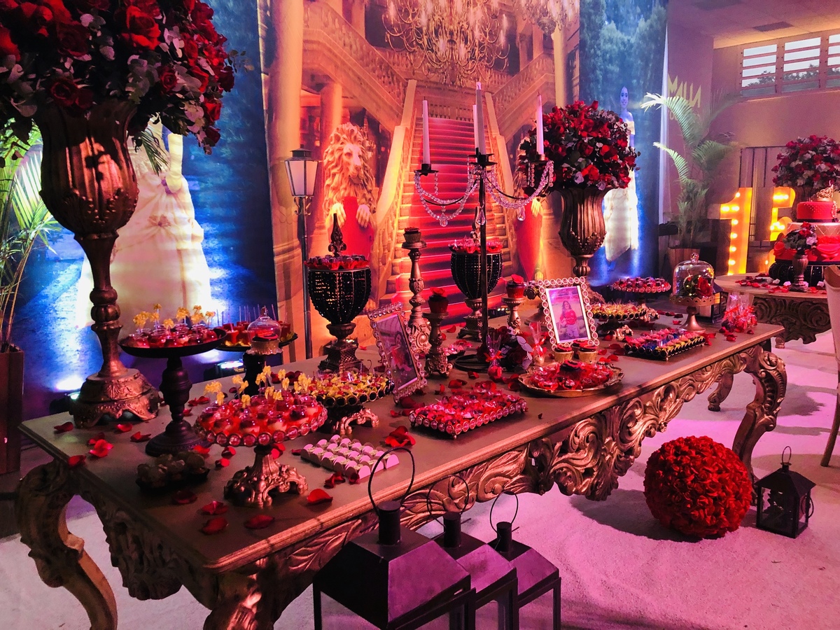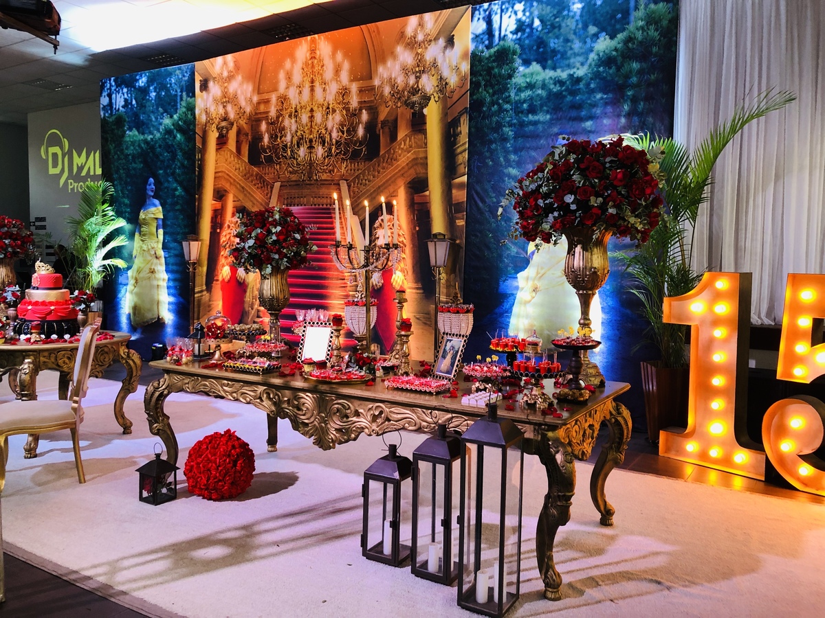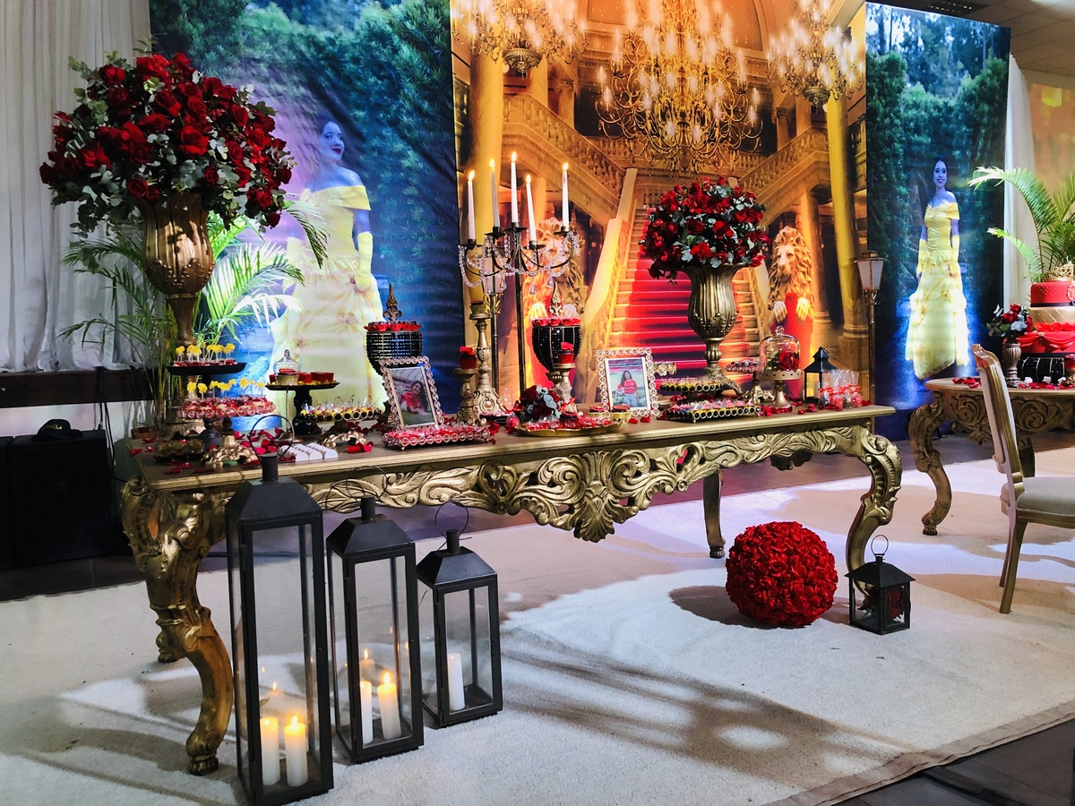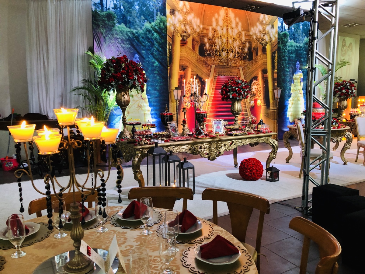 Decoração de 15 anos com o tema do clássico da Disney "A Bela e a Fera", realizada por Ana Menezes Eventos, na CEPE, em Canoas.