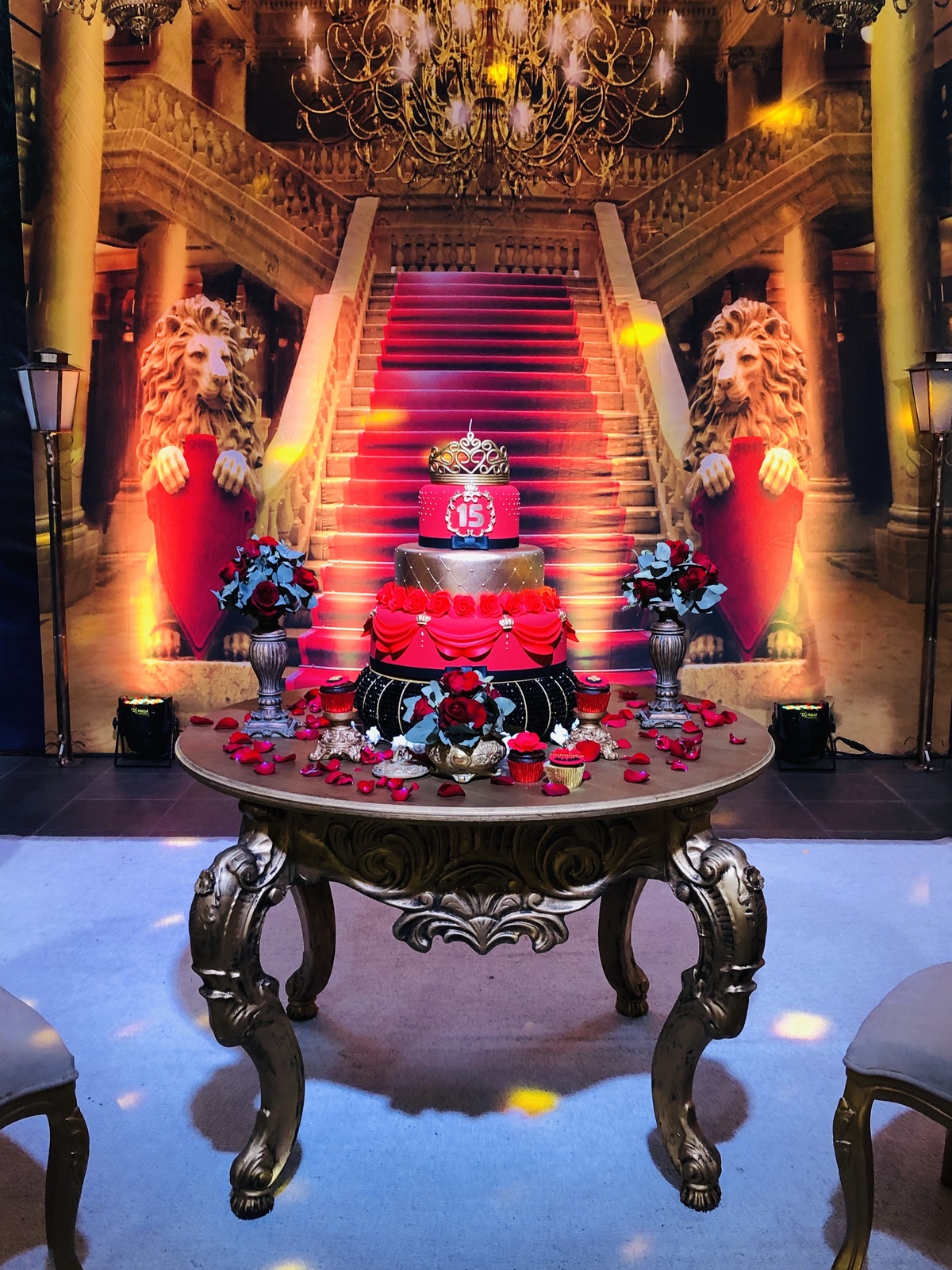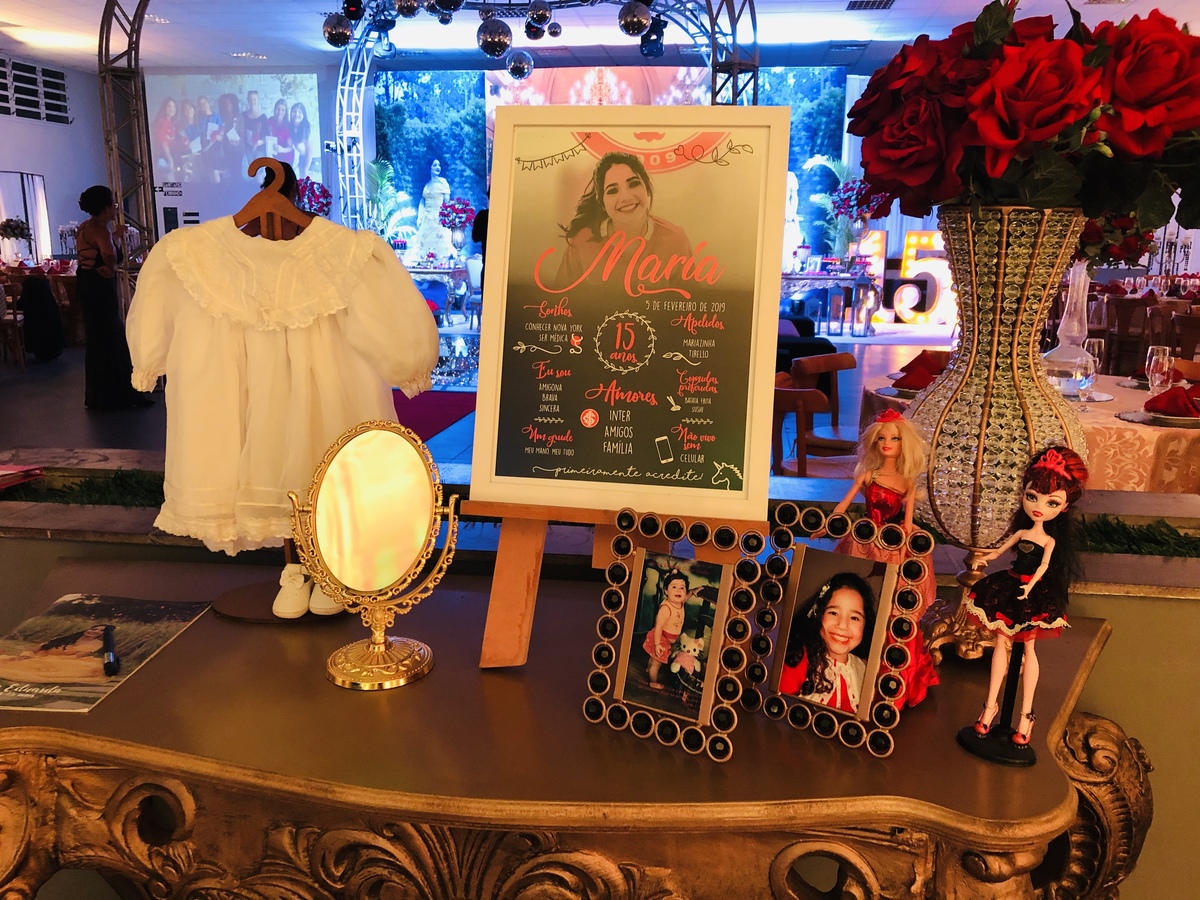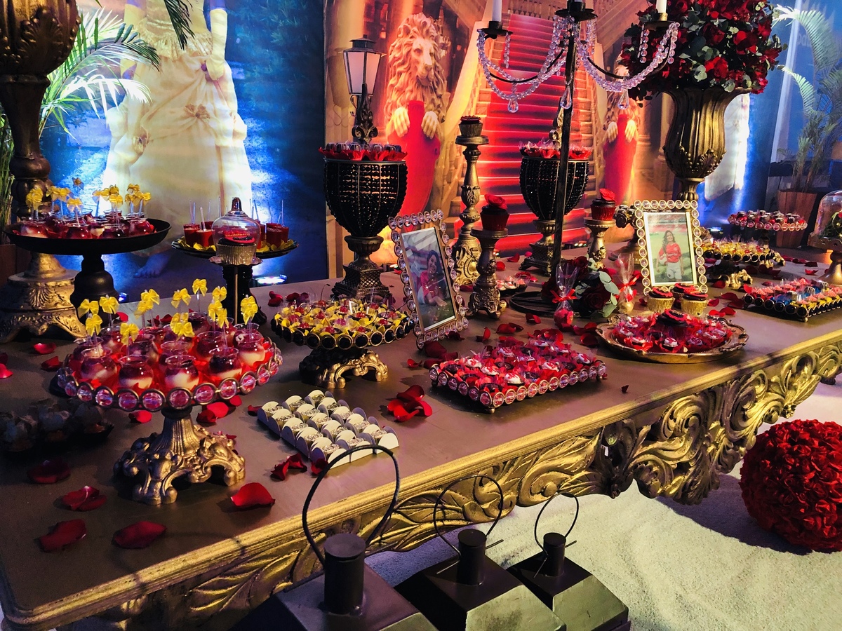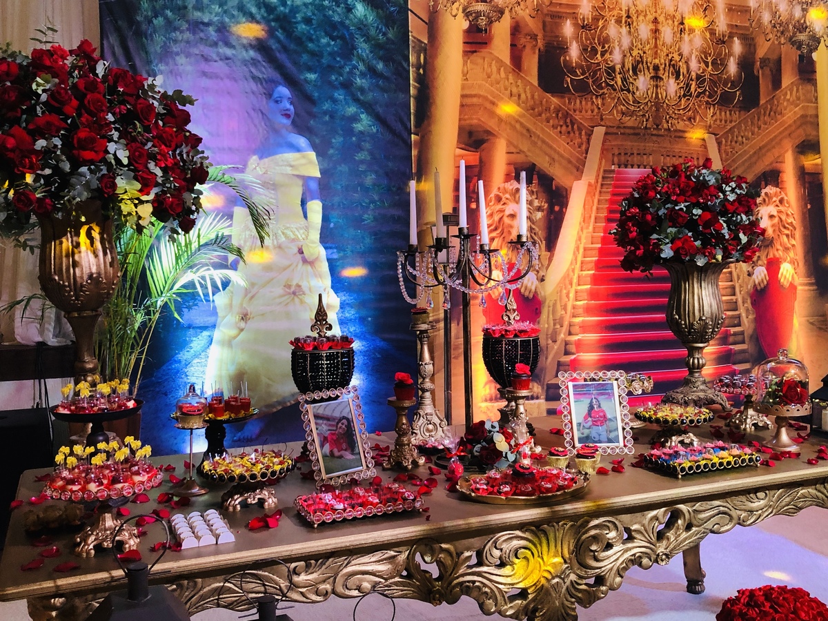 Decoração de 15 anos com o tema do clássico da Disney "A Bela e a Fera", realizada por Ana Menezes Eventos, na CEPE, em Canoas.
